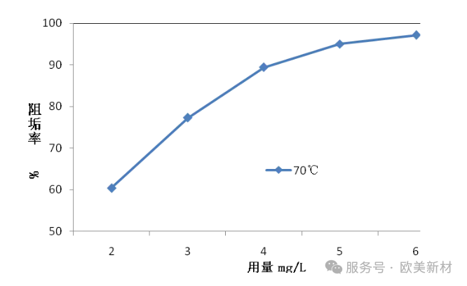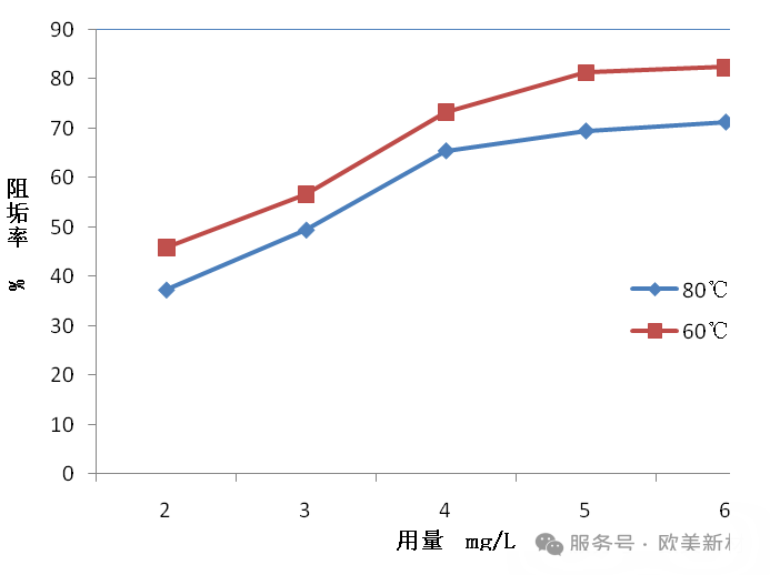 2、从测定的工作温度来看,同等用量下,60℃下的阻垢率要高于80℃下的阻垢率,温度越高,碳酸钙的结垢倾向越重。