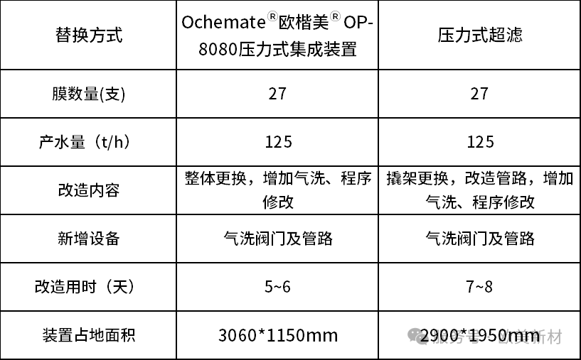 相较于普通的压力式超滤,OchemateⓇ欧楷美Ⓡ OP-8080压力式集成装置有着安装简易、布置速度快、占地面积小等优点,具体对比如下: