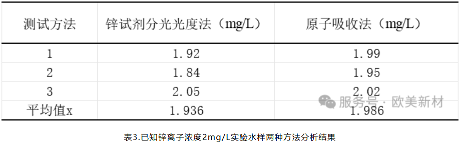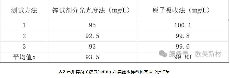 用由国家标准物质中心提供的氧化锌纯度标准物质,配制锌离子含量为100mg/L和2mg/L的的实验水样,用锌试剂分光光度法和原子吸收法进行检测,检测结果见表2,表3。